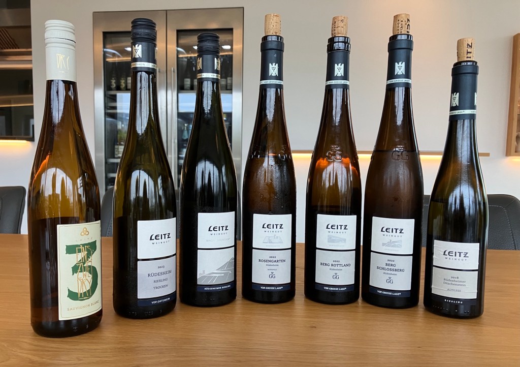 I must admit to loving Riesling but have a sad lack of experience with the best of Germany. The basic ones around $30 available in Australia are lovely on a hot summer evening but don’t seem to compete in terms of depth with locals at the price point. Spending more and it always seems to be other grapes. And I’m not a big fan of sugar, albeit, yes, the best 8% or 9% Germans do have a scintillatingly delicious balance where you hardly notice any sweetness. Planning to go through the enormous Frankfurt airport on this year’s Europe trip, the overused Googlemap app showed Rüdesheim was a hour away down the river. I picked three producers easy to reach by train and sent begging emails. Fancy being bothered by an old wine nut for a while? The nicest reply was from Leitz, please come and taste. Well, that’s lovely, yes please. Getting off the local S Bahn, a misty autumnal stroll from the pretty village of Geisenheim to Leitz was under a slope of vines just thinking of a winter doze. A warm welcome and a generous tasting took us on a trip across that slope overlooking the Rhine with peaks in the GGs. The bottles opened started with their cutely named Eins Zwei Dry and climbed up the heights of three GGs. The Schlossberg was really loooong.